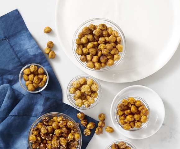 Ingredients: Original 2 15-oz. cans chickpeas 2 tbsp. extra-virgin olive oil 1/4 tsp. salt 1/4 tsp. pepper Honey-Sesame (add following ingredients to Original recipe) 2 tbsp. honey 1 tbsp. sesame oil 1 tbsp. sesame seeds 1 tbsp. sugar 1/2 tsp. garlic powder 1/2 tsp. five-spice powder BBQ (add following ingredients to Original recipe) 1 tsp. dark brown sugar 1/2 tsp. ground cumin 1/2 tsp. ground paprika 1/2 tsp. garlic powder 1/2 tsp. chili powder Masala (add following ingredients to Original recipe) 1/2 tsp. garam masala 1/2 tsp. ground cumin 1/2 tsp. ground ginger 1/4 tsp. cayenne (ground red) pepper Spicy Buffalo (add following ingredients to Original recipe) 1/4 c. cayenne pepper hot sauce Maple-Cinnamon 2 tbsp. maple syrup 2 tsp. sugar 1 tsp. ground...