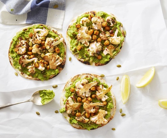 Ingredients 12 oz. small cauliflower florets 1 tbsp. extra-virgin olive oil salt BBQ Chickpea "Nuts" (recipe) 2 ripe avocados 2 tbsp. lemon juice 4 flat-breads or pocket-less pitas, toasted 2 tbsp. roasted salted pepitas Hot sauce, for servingDirections: On a large rimmed baking sheet, toss cauliflower with olive oil and 1/4 teaspoon salt; roast in 425 degree F oven for 25 minutes along with one-fourth recipe BBQ Chickpea "Nuts". Mash avocados with lemon juice and pinch salt; spread all over flat-breads. Top with roasted cauliflower, chickpeas and pepitas. Serve with drizzle of hot sauce.