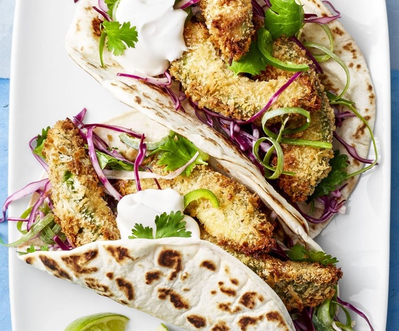 Ingredients: 1/4 c. spelt flour Sea salt pepper 2 tbsp. flax seed powder w/ 6 tbsp. water 1 c. panko breadcrumbs 2 tbsp. olive oil 2 medium firm but ripe avocados 1 lime, plus wedges for serving 4 tbsp. vegan mayonnaise 1/2 small red cabbage (about 1 pound), cored and thinly sliced 2 scallions, thinly sliced 1 jalapeño, seeded and thinly sliced 1/2 c. fresh cilantro leaves, plus more for serving 8 small flour tortillas, warmed Vegan sour cream, for servingDirections: Heat oven to 425°F and line a large rimmed baking sheet with nonstick foil. In a small bowl, whisk together the flour and ¼ teaspoon each salt and pepper. Lightly beat the flax seed powder mix in a second small bowl. In a third...