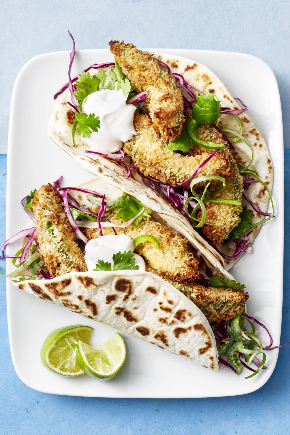 - Meanwhile, finely grate the lime zest into a large bowl, then squeeze in 2 tablespoon juice. Whisk in the vegan mayonnaise and a pinch of salt. Add the cabbage, scallions, and jalapeño and toss to coat; fold in the cilantro. Fill the tortillas with the avocados and top with the cabbage slaw. Serve with extra cilantro, lime wedges and vegan sour cream, if desired.