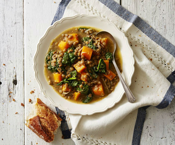 Ingredients: 2 medium shallots, thinly sliced 1 tbsp. finely chopped peeled fresh ginger 1 tbsp. vegetable oil 1 tsp. ground coriander 1/2 tsp. ground cardamom 1 small butternut squash, peeled, seeded and cut into 1 1/2" chunks 1 lb. green lentils, picked over 6 c. chicken or vegetable broth 5 c. packed baby spinach 1 tbsp. cider vinegar Directions In pressure-cooker pot on medium, cook shallots and ginger in oil 5 minutes or until shallots are golden, stirring. Add coriander and cardamom; cook 1 minute, stirring. Add squash, lentils, broth and 1/4 teaspoon salt.Cover, lock and bring up to pressure on high. Reduce heat to medium-low. Cook 12 minutes. Release pressure by using quick-release function.Stir in spinach, vinegar and 1/2 teaspoon each of salt...