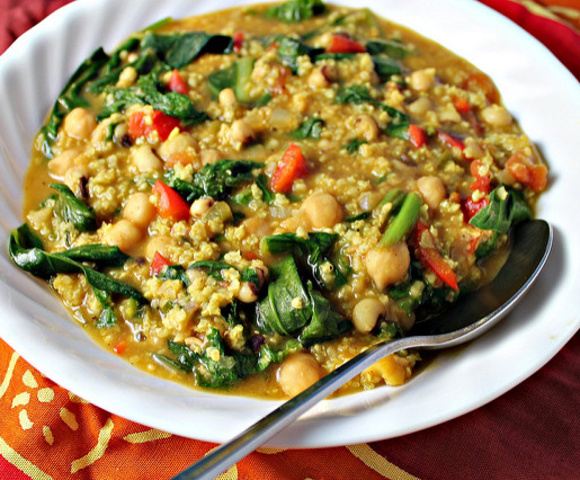 Ingredients: 1 Can Chickpeas 1 Cup cooked quinoa (millet or wild/black rice can be use) 2 Tbsp Coconut Oil (can sub vegetable broth to make this an oil free recipe) 1 medium red bell pepper, chopped 1 habanero/scotch bonnet pepper, seeded and finely chopped 2 stalk of green onion, finely chopped 4 cups vegetable broth 2 tomatoes, chopped 1 tbsp curry powder 1 tsp salt & pepper to taste 1 lb mixed greens - kale/collards/spinach 1 can light coconut milk PREPARATION: Heat oil in a medium stockpot over medium heat. Add onion, bell pepper, and habanero/scotch bonnet pepper and cook, stirring, until softened, about 5 minutes. Add green onion and cook, stirring constantly, about 1 minute. Add broth, chickpeas, tomatoes,...