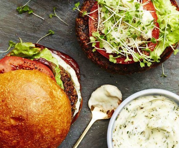 Ingredients: Burgers 4 medium portobello mushroom caps (about 1 lb.), gills removed, chopped 1/2 c. walnuts 2 tbsp. sunflower oil 1/4 c. Chopped red onion 3 green onions, chopped 2 tsp. apple cider vinegar 1 c. cooked quinoa 1/2 c. cornstarch Whole-grain burger buns sprouts Lettuce Sliced tomatoes Rosemary Mayo 1/2 c. mayonnaise 1 tsp. finely chopped fresh rosemary 1 tsp. lemon juice Kosher salt Directions: Make the Burgers: Preheat oven to 375 degrees F. In 3-quart, shallow baking dish, toss mushrooms with walnuts, garlic, 1 tablespoon oil, 3⁄4 teaspoon salt, and 1⁄4 teaspoon pepper; spread in even layer. Bake 20 minutes or until mushrooms are tender. Set aside to cool. Turn oven off.In food processor, pulse mushroom mixture, red onion, green onions, and vinegar...