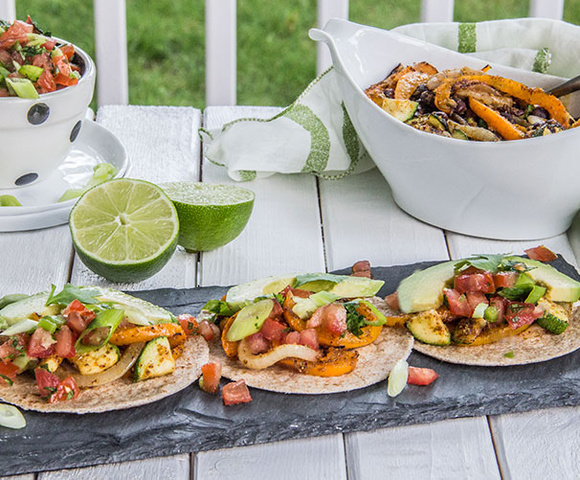 Ingredients: For the Grilled Vegetable and Black Bean Fajitas: 1 onion, thinly sliced 1 bell pepper, thinly sliced 1 organic zucchini, halved lengthwise and thinly sliced 16 ounces organic black beans, drained and thoroughly rinsed 1½ teaspoons onion powder 1½ teaspoons dried oregano ¾ teaspoons cumin ¾ teaspoons chili powder 3 tablespoons extra virgin olive oil Fresh Homemade Salsa (recipe below) 1 avocado, pitted, peeled, and sliced 12 organic whole wheat tortillas Salt For the Fresh Homemade Salsa: 1 large tomato, diced ¼ cup green onions (scallions), chopped ½ jalapeño, seeded and finely diced 3 tablespoons fresh cilantro, chopped 1 lime, freshly squeezed Salt For the Grilled Vegetable and Black Bean Fajitas: Prepare the grill for 375 degrees F. Layer first the onion, then...
