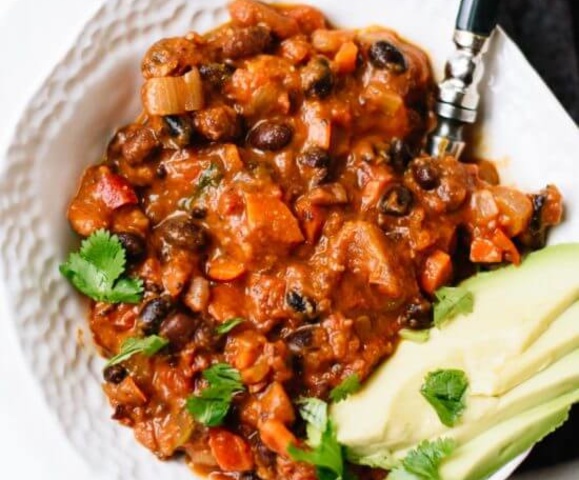 Ingredients: 2 tablespoons olive oil 1 medium red onion, chopped 1 large red bell pepper, chopped 2 ribs celery, chopped 1/2 teaspoon salt, divided 1 cup green onions 2 tablespoons chili powder 2 teaspoons ground cumin 1 1/2 teaspoons smoked paprika 1 teaspoon dried oregano 1 large can (28 ounces) or 2 small cans (15 ounces each) diced tomatoes*, with their juices 2 cans (15 ounces each) black beans, rinsed and drained 1 can (15 ounces) pinto beans, rinsed and drained 2 cups vegetable broth or water 1 bay leaf 2 tablespoons chopped fresh cilantro, plus more for garnishing 1 to 2 teaspoons sherry vinegar or red wine vinegar or lime juice, to taste Garnishes: chopped cilantro, sliced avocado, tortilla chips, grated cheddar cheese,...