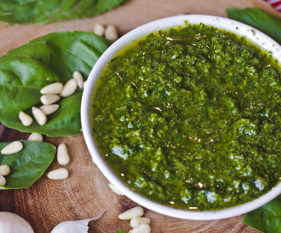 Ingredients: 1 bunch of parsley 2 bunches of basil 1/4 cup pine nuts 1/8 tsp Himalayan salt 1/4 cup olive oil (or more if required for smooth consistency) Put all ingredients in your food-processor, blend and ready! Great as a basis for salad dressings (just add some lemon juice), as a raw pasta sauce or with sprouted bread!
