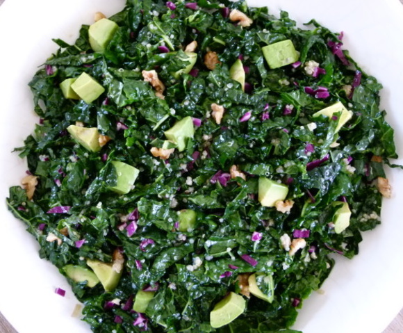 Ingredients: 3 cups Kale, de-stemmed and chopped 1 Avocado 1 Tbs Olive Oil 1 tsp Sea Salt 8 Grape Tomatoes, cut as desired 2 Green Onions, white and green parts 1 Tbs Lemon Juice (1/2 Lemon) Put chopped kale in bowl and drizzle over salt and olive oil. Massage this around in the bowl to soften the kale a little. Crush the avocado into the boil with the kale, using a knife. Add the rest of the ingredients (except lemon juice) and stir to coat. Then drizzle lemon juice over top just before serving. One of the beautiful things about raw salads, is many of them just require finding the right ingredients and tossing together!