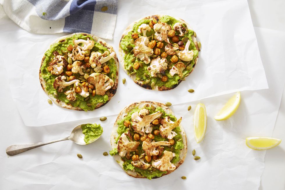- Mash avocados with lemon juice and pinch salt; spread all over flat-breads. Top with roasted cauliflower, chickpeas and pepitas. Serve with drizzle of hot sauce.